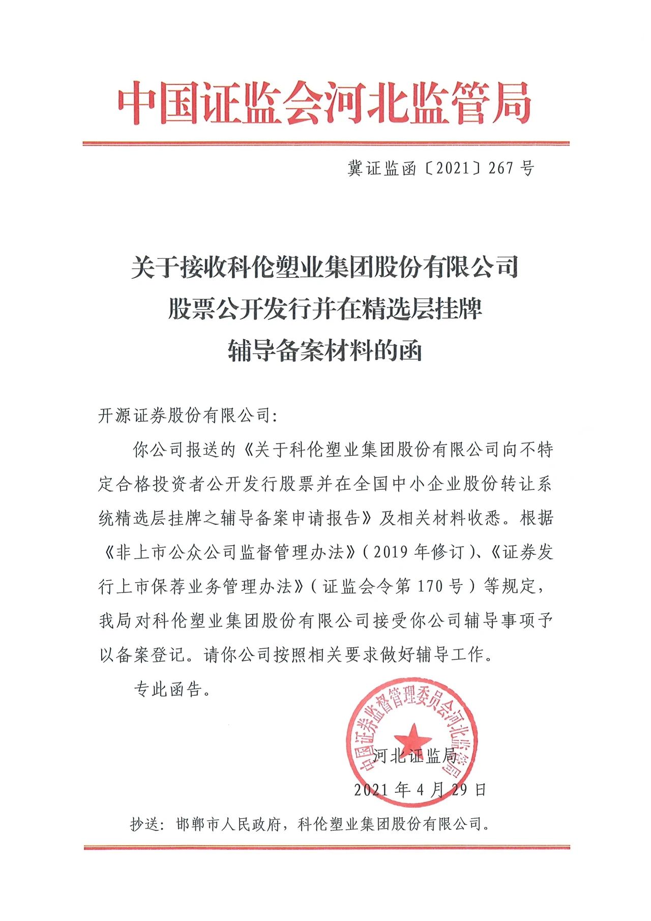 日前,科倫塑業(yè)集團(tuán)股份有限公司IPO(首次發(fā)行股票)取得可喜進(jìn)展,中國(guó)證監(jiān)會(huì)河北監(jiān)管局已批準(zhǔn)開源證券股份有限公司對(duì)科倫塑業(yè)集團(tuán)進(jìn)行上市輔導(dǎo)。