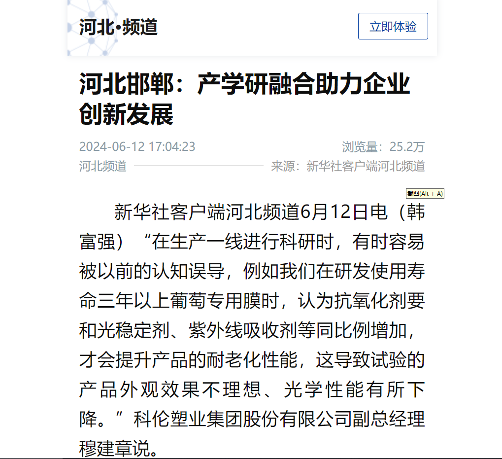 科倫塑業(yè)集團(tuán)股份有限公司于2024年6月12日就公司成長(zhǎng)歷程、產(chǎn)學(xué)研融合助力企業(yè)創(chuàng)新發(fā)展方面,公司副總經(jīng)理穆建章接受新華社河北分社采訪,報(bào)道詳情如下