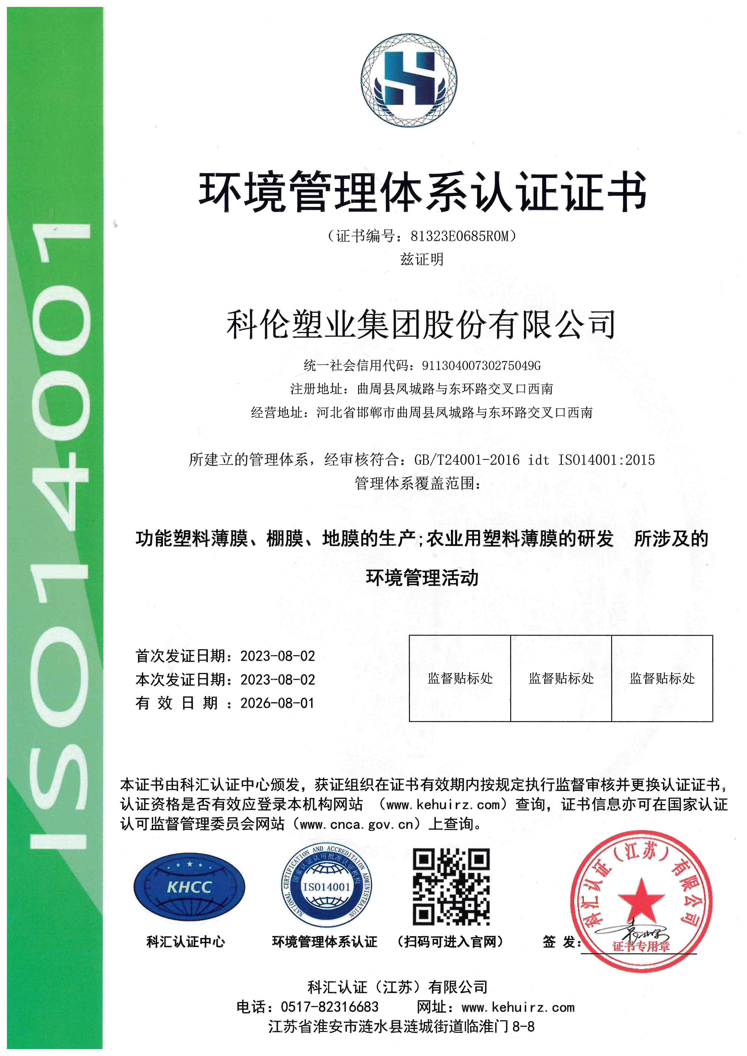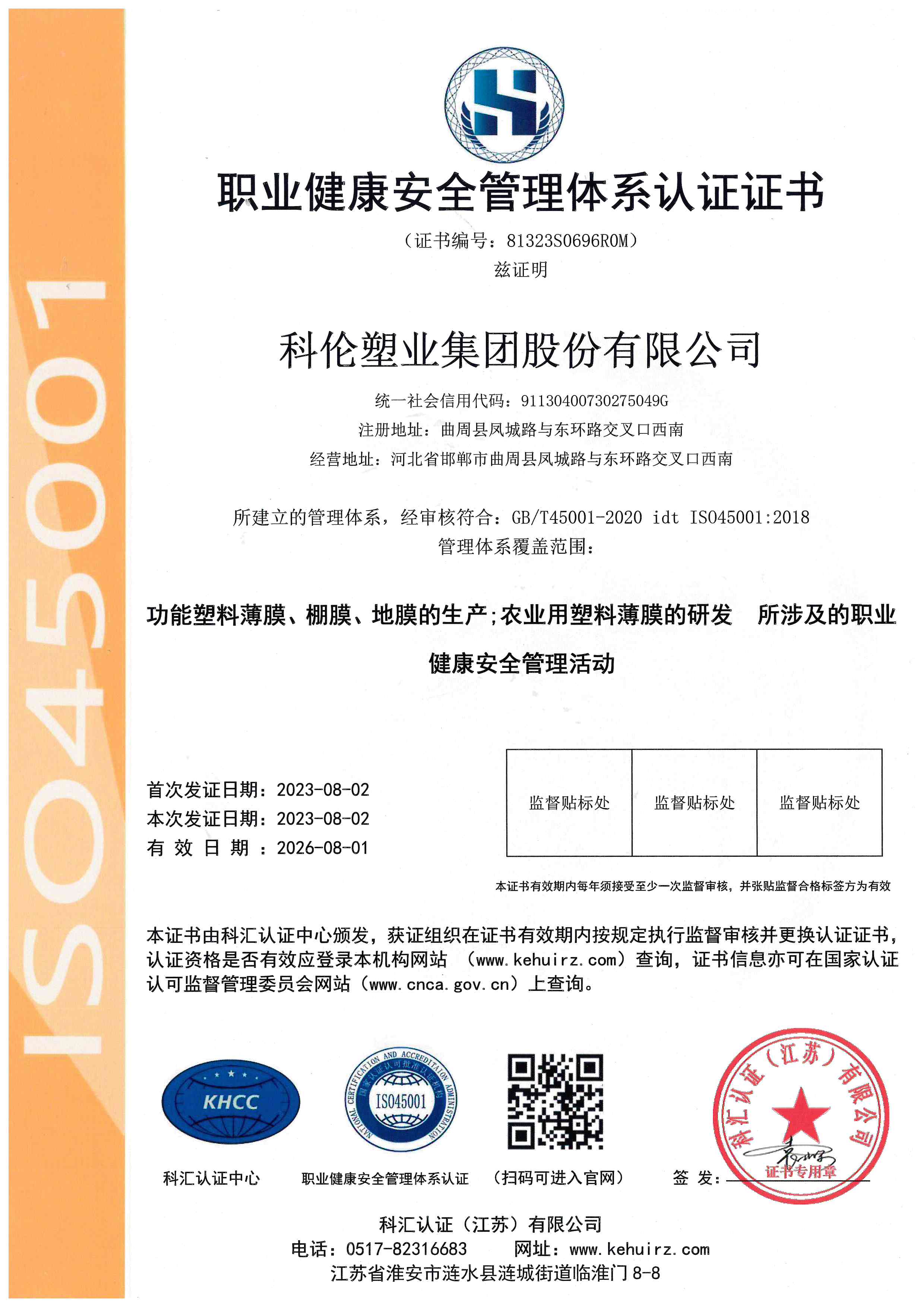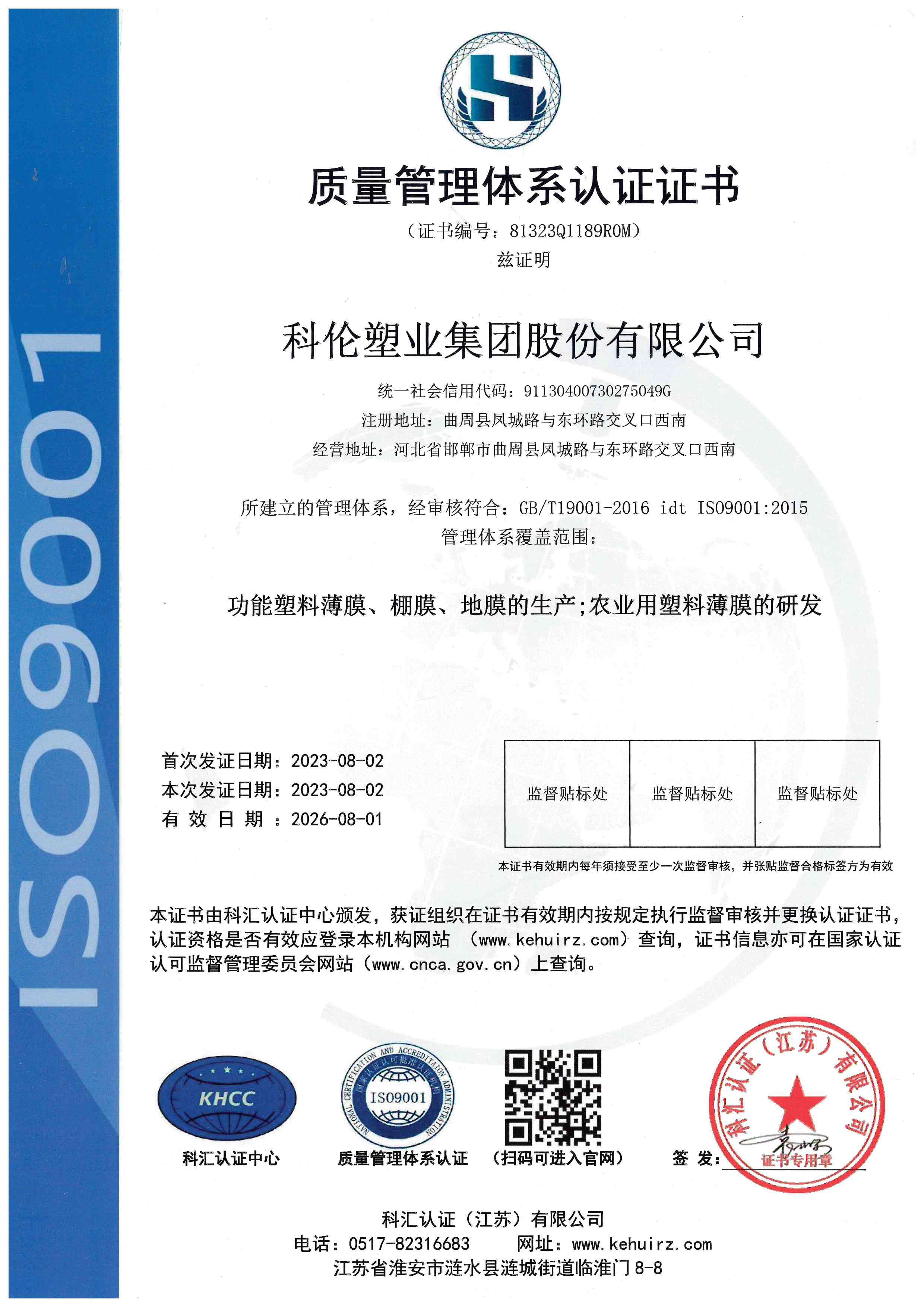 科倫塑業(yè)集團(tuán)是大型現(xiàn)代高效(設(shè)施)農(nóng)業(yè)裝備供應(yīng)商之一,已全面通過ISO9001:2015國(guó)際質(zhì)量管理體系認(rèn)證、ISO14001:2015國(guó)際環(huán)境管理體系認(rèn)證、ISO45001:2018職業(yè)健康安全管理體系認(rèn)證。