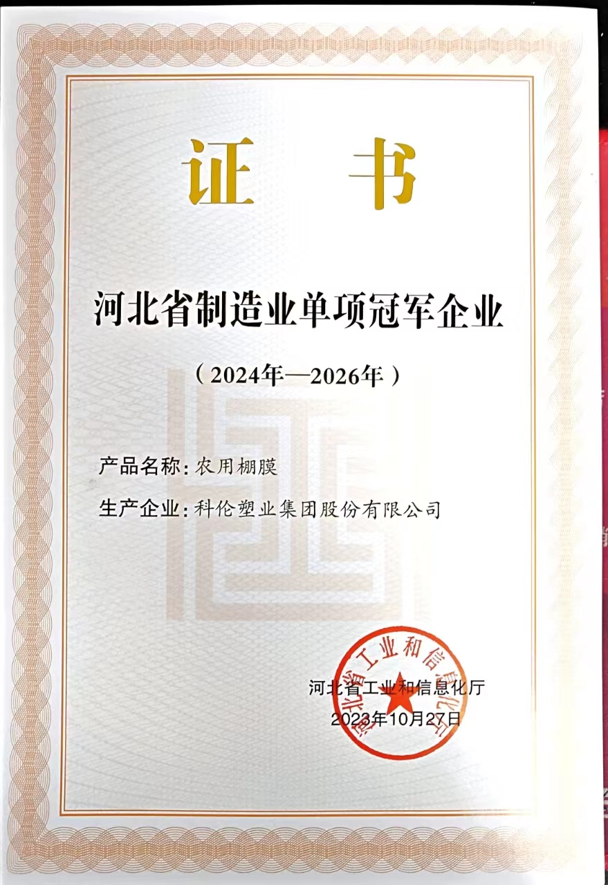科倫塑業(yè)集團(tuán)是中國(guó)塑料加工工業(yè)協(xié)會(huì)農(nóng)膜專委會(huì)副主任單位、兩項(xiàng)農(nóng)棚膜國(guó)家標(biāo)準(zhǔn)和多項(xiàng)團(tuán)體標(biāo)準(zhǔn)的起草及修訂單位、國(guó)家專精特新“小巨人”企業(yè)、國(guó)家星火計(jì)劃項(xiàng)目承擔(dān)單位、國(guó)家高新技術(shù)企業(yè)、第十一屆中國(guó)技術(shù)市場(chǎng)協(xié)會(huì)金橋獎(jiǎng)優(yōu)秀項(xiàng)目獎(jiǎng)獲得者、中國(guó)塑料加工業(yè)百?gòu)?qiáng)企業(yè)、全國(guó)農(nóng)膜行業(yè)功勛企業(yè)、中國(guó)農(nóng)用塑料薄膜行業(yè)十強(qiáng)企業(yè)、河北省質(zhì)量標(biāo)桿企業(yè)、河北省輕工業(yè)排頭兵企業(yè)、河北省2021年度輕工行業(yè)品牌影響力50強(qiáng)企業(yè)。